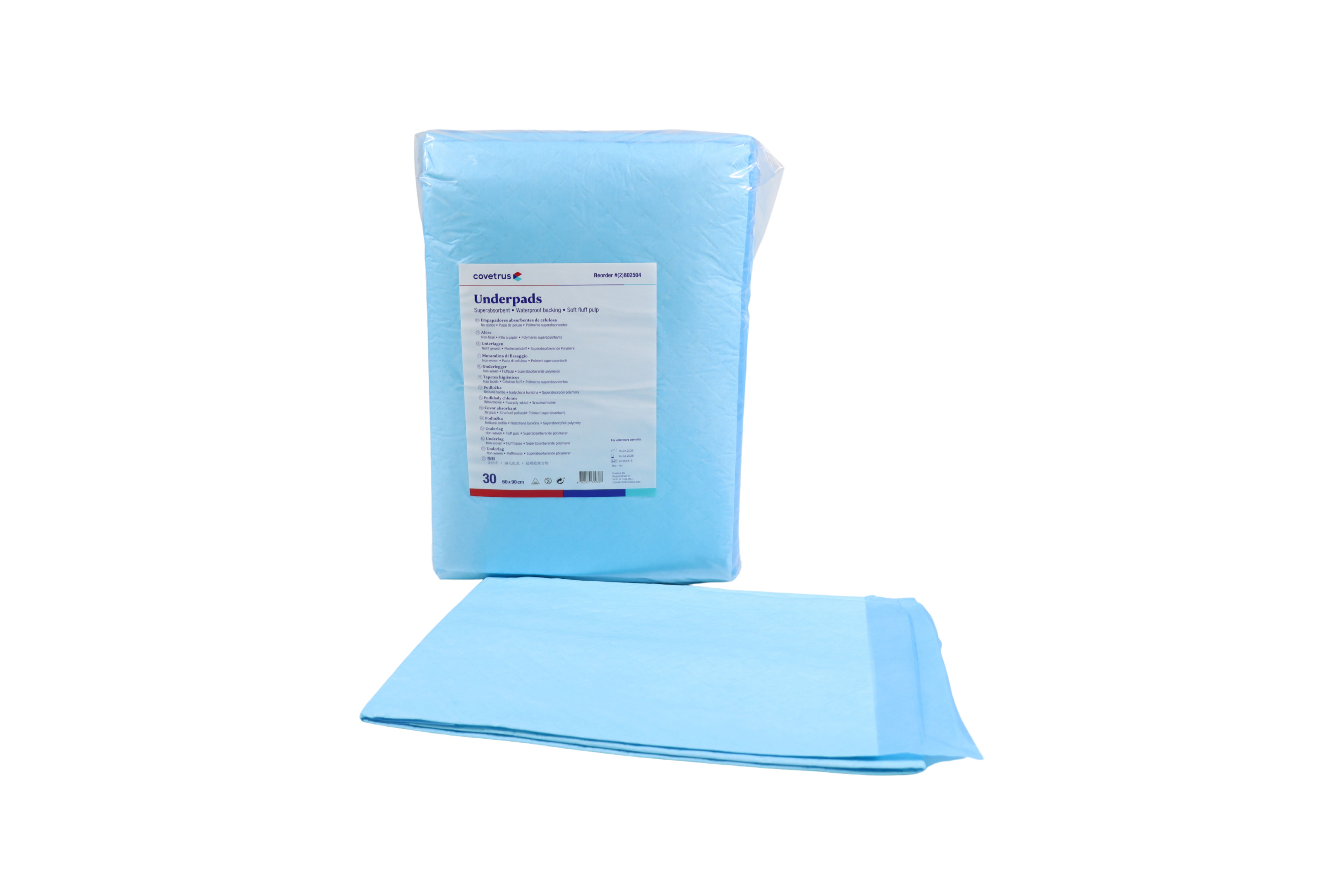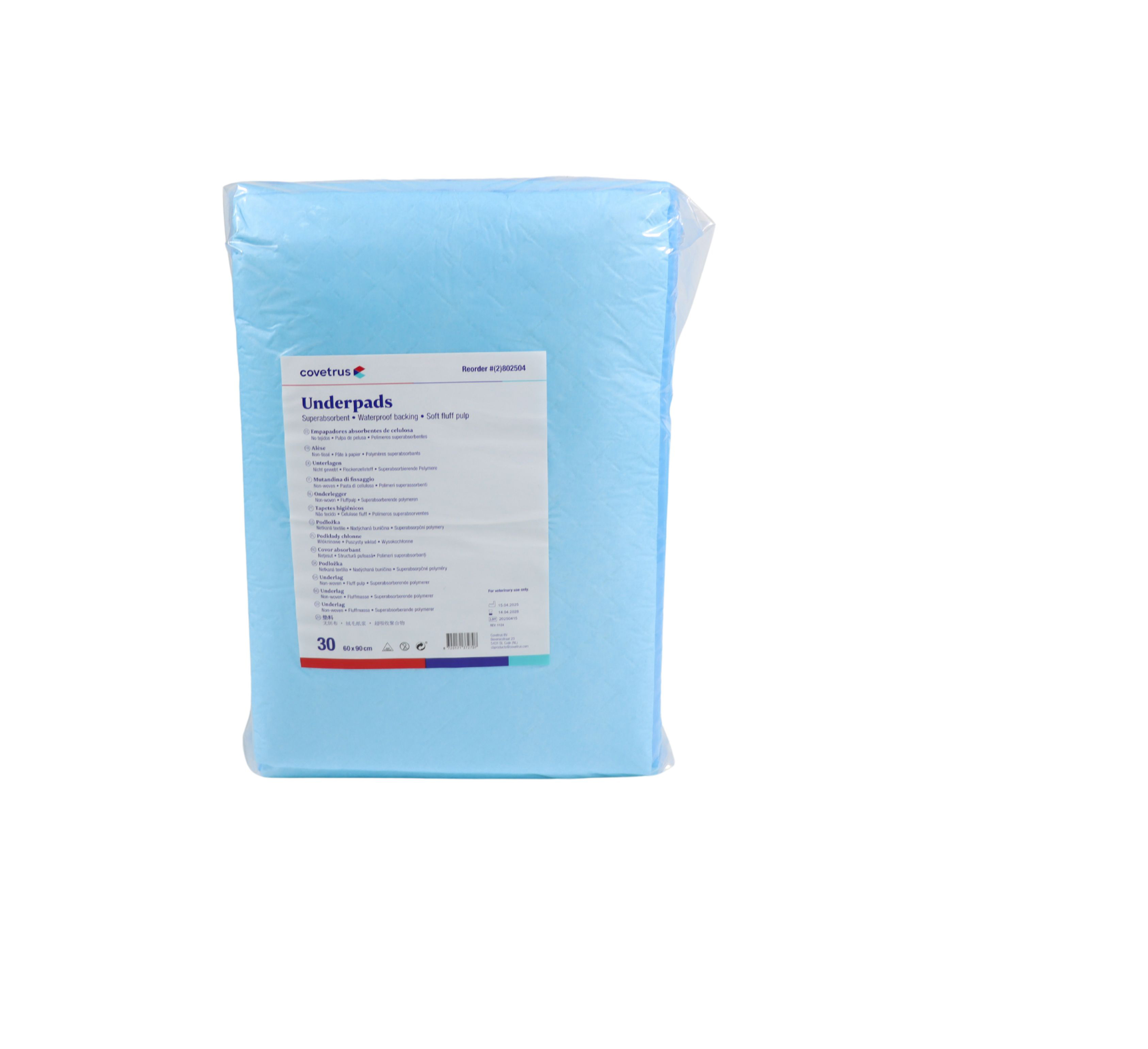 Underpads for Veterinary use. Waterproof backing, fast absorbable, non woven, fluff pulp, superabsorbent polymers. Absorbation capacity: 3400ml
